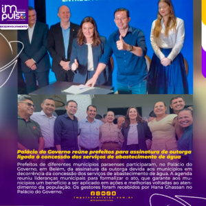 Prefeitos de diferentes municípios paraenses participaram, no Palácio do Governo, em Belém, da assinatura da outorga devida aos municípios em decorrência da concessão dos serviços