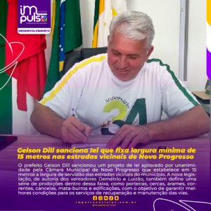 O prefeito Gelson Dill sancionou um projeto de lei aprovado por unanimidade pela Câmara Municipal de Novo Progresso que estabelece em 15 metros a largura