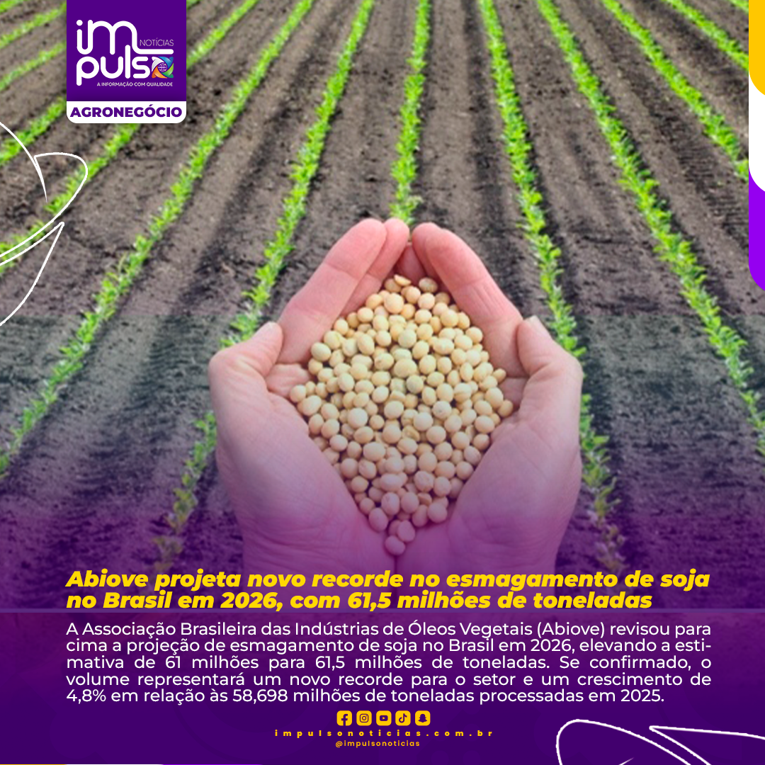 A Associação Brasileira das Indústrias de Óleos Vegetais (Abiove) revisou para cima a projeção de esmagamento de soja no Brasil em 2026, elevando a estimativa de 61 milhões para 61,5 milhões de toneladas. Se confirmado, o volume representará um novo recorde para o setor e um crescimento de 4,8% em relação às 58,698 milhões de toneladas processadas em 2025.