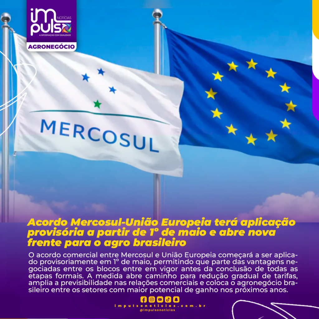 O acordo comercial entre Mercosul e União Europeia começará a ser aplicado provisoriamente em 1º de maio, permitindo que parte das vantagens negociadas entre os blocos entre em vigor antes da conclusão de todas as etapas formais. A medida abre caminho para redução gradual de tarifas, amplia a previsibilidade nas relações comerciais e coloca o agronegócio brasileiro entre os setores com maior potencial de ganho nos próximos anos.