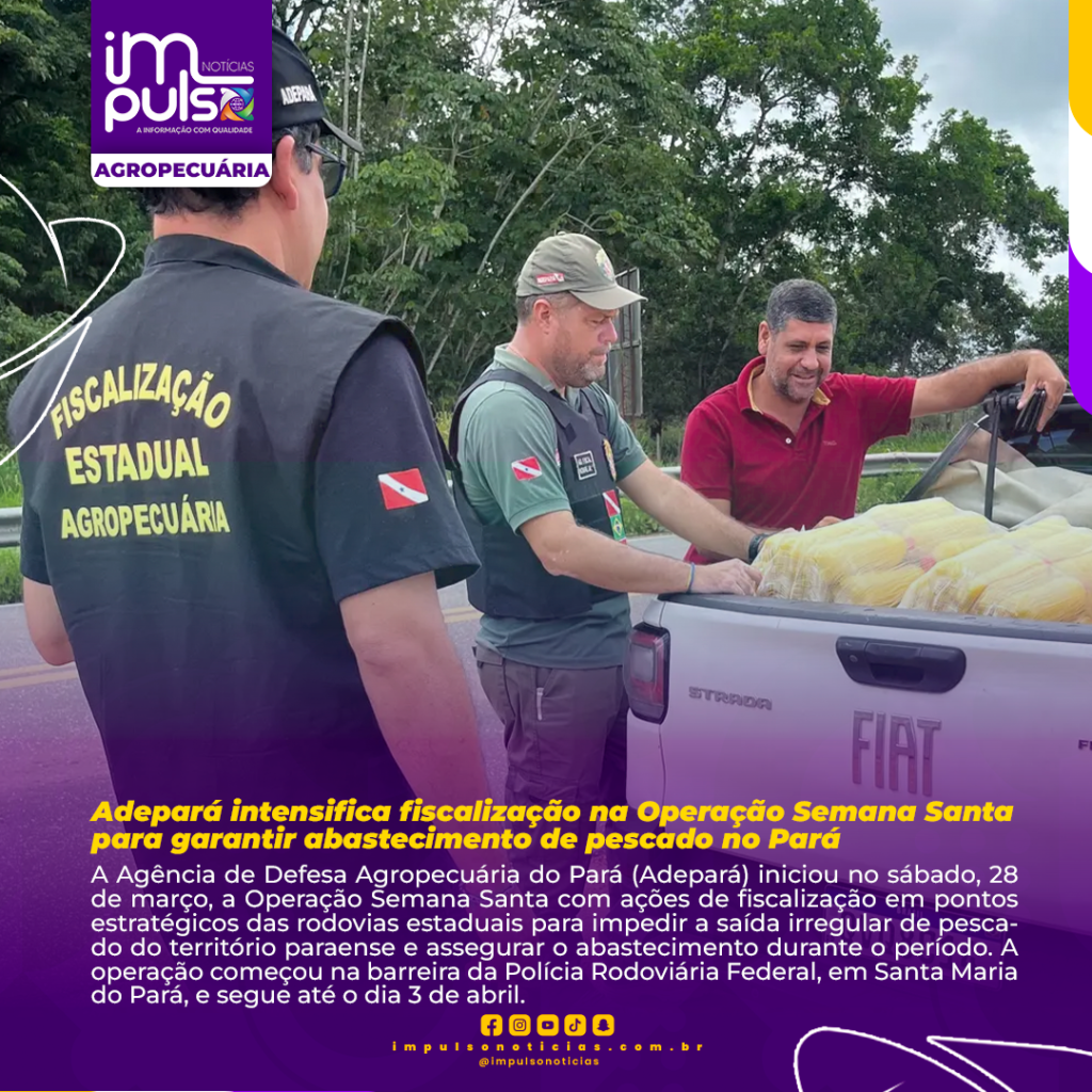 A Agência de Defesa Agropecuária do Pará (Adepará) iniciou no sábado, 28 de março, a Operação Semana Santa com ações de fiscalização em pontos estratégicos das rodovias estaduais para impedir a saída irregular de pescado do território paraense e assegurar o abastecimento durante o período. A operação começou na barreira da Polícia Rodoviária Federal, em Santa Maria do Pará, e segue até o dia 3 de abril.