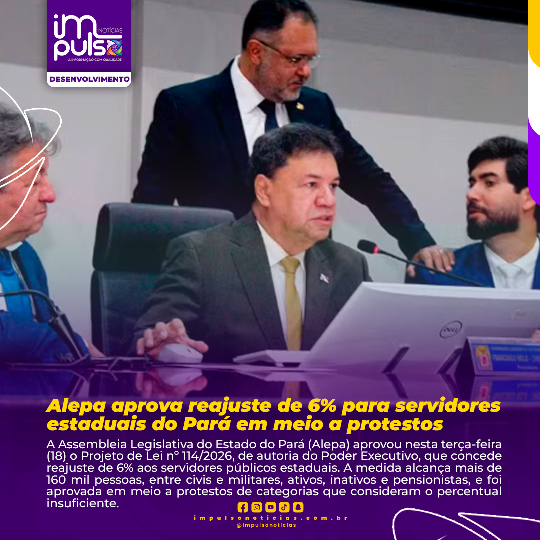 A Assembleia Legislativa do Estado do Pará (Alepa) aprovou nesta terça-feira (18) o Projeto de Lei nº 114/2026, de autoria do Poder Executivo, que concede reajuste de 6% aos servidores públicos estaduais. A medida alcança mais de 160 mil pessoas, entre civis e militares, ativos, inativos e pensionistas, e foi aprovada em meio a protestos de categorias que consideram o percentual insuficiente.