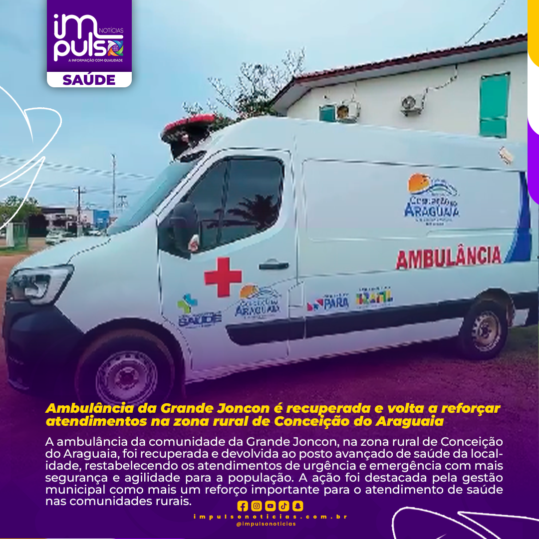 A ambulância da comunidade da Grande Joncon, na zona rural de Conceição do Araguaia, foi recuperada e devolvida ao posto avançado de saúde da localidade, restabelecendo os atendimentos de urgência e emergência com mais segurança e agilidade para a população. A ação foi destacada pela gestão municipal como mais um reforço importante para o atendimento de saúde nas comunidades rurais.