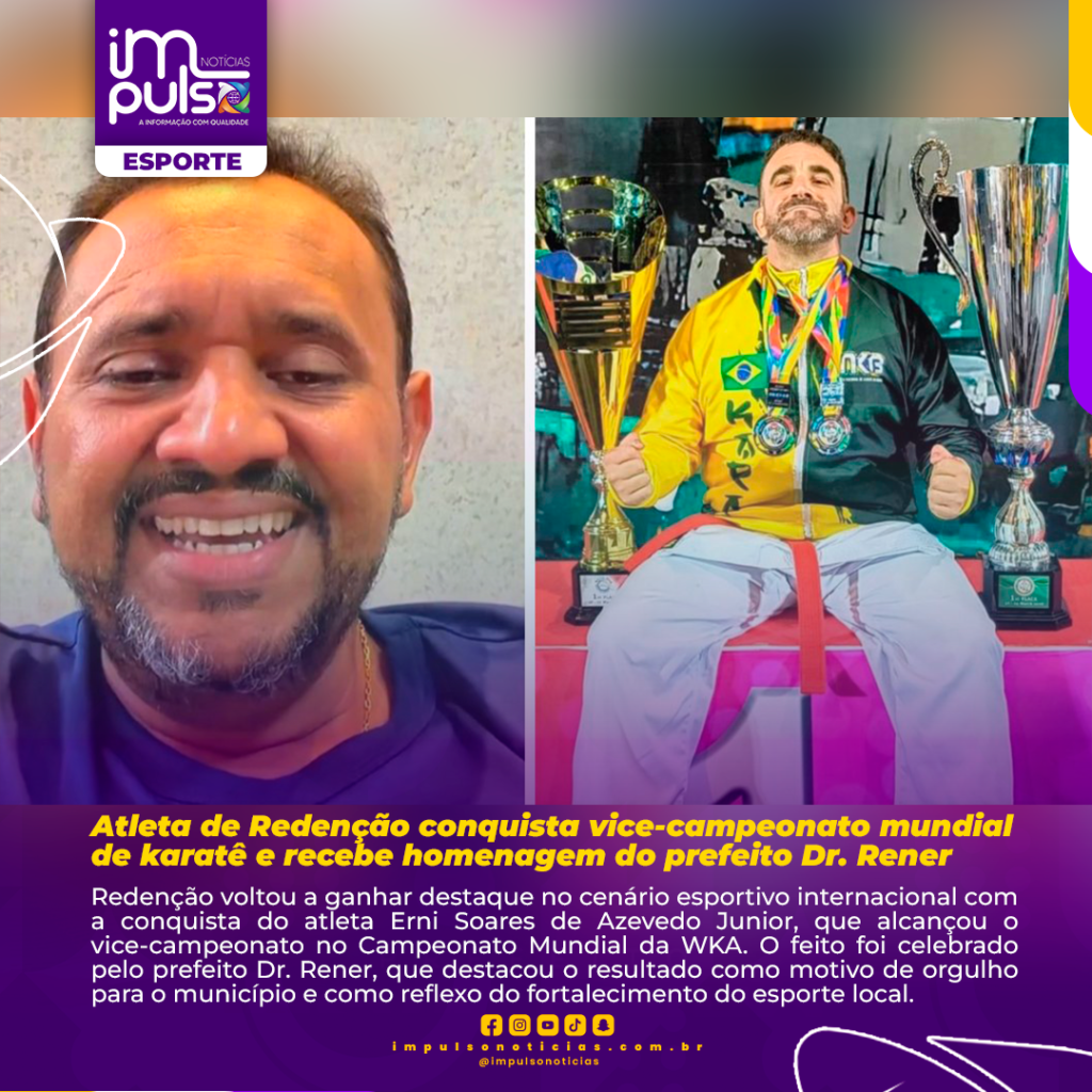 Redenção voltou a ganhar destaque no cenário esportivo internacional com a conquista do atleta Erni Soares de Azevedo Junior, que alcançou o vice-campeonato no Campeonato Mundial da WKA. O feito foi celebrado pelo prefeito Dr. Rener, que destacou o resultado como motivo de orgulho para o município e como reflexo do fortalecimento do esporte local.