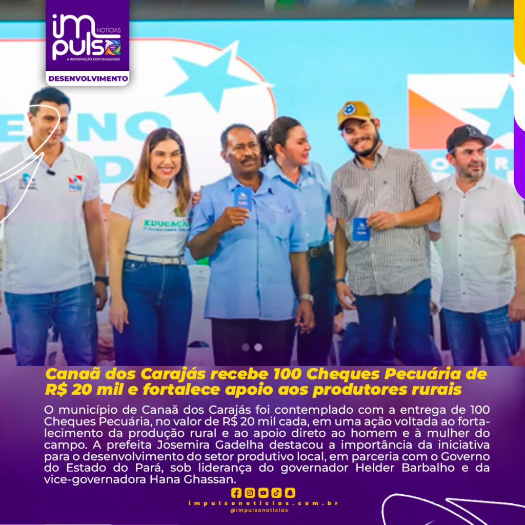 O município de Canaã dos Carajás foi contemplado com a entrega de 100 Cheques Pecuária, no valor de R$ 20 mil cada, em uma ação voltada ao fortalecimento da produção rural e ao apoio direto ao homem e à mulher do campo. A prefeita Josemira Gadelha destacou a importância da iniciativa para o desenvolvimento do setor produtivo local, em parceria com o Governo do Estado do Pará, sob liderança do governador Helder Barbalho e da vice-governadora Hana Ghassan.