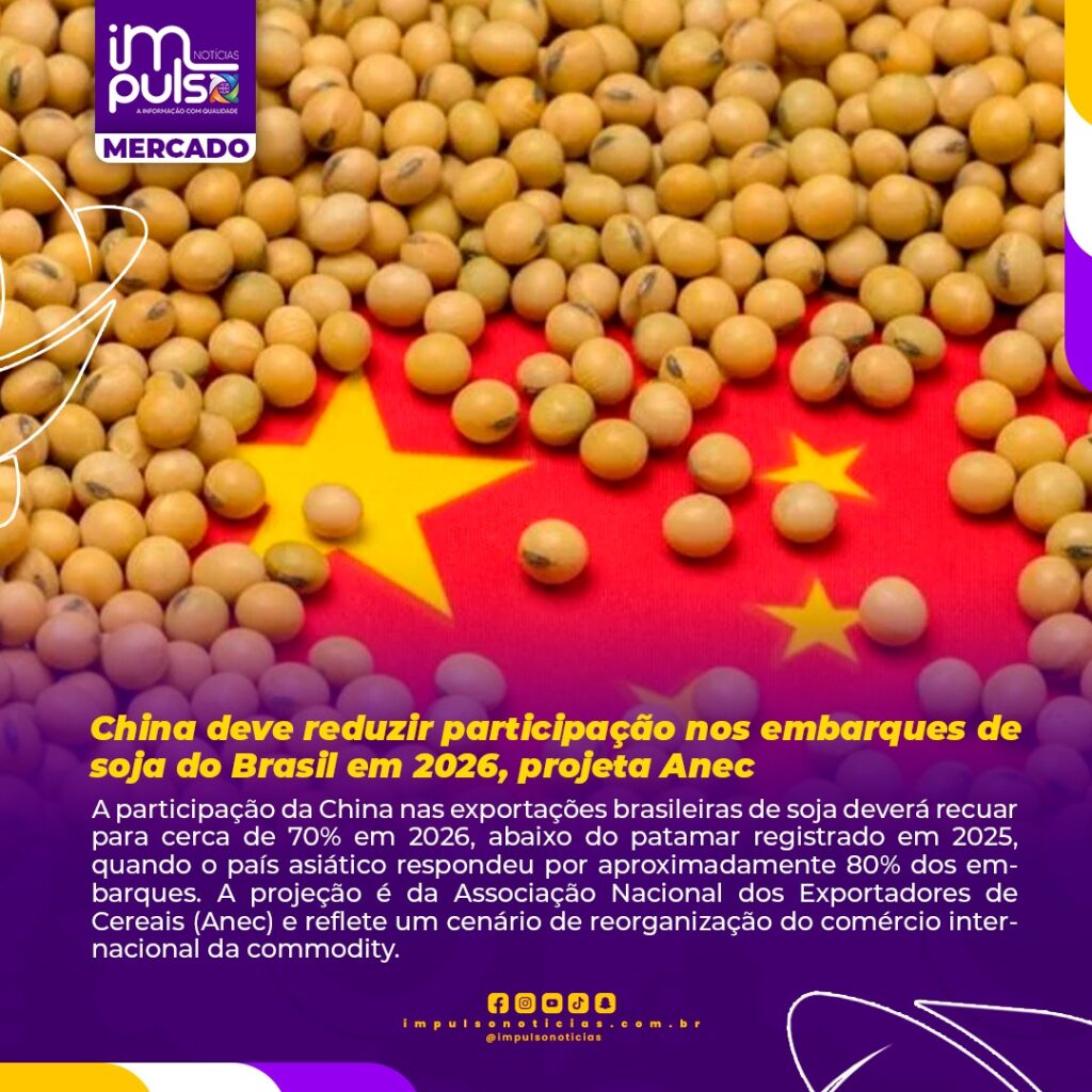 A participação da China nas exportações brasileiras de soja deverá recuar para cerca de 70% em 2026, abaixo do patamar registrado em 2025, quando o país asiático respondeu por aproximadamente 80% dos embarques. A projeção é da Associação Nacional dos Exportadores de Cereais (Anec) e reflete um cenário de reorganização do comércio internacional da commodity.