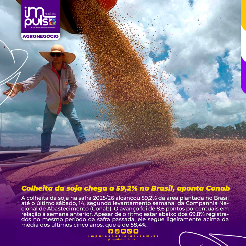 A colheita da soja na safra 2025/26 alcançou 59,2% da área plantada no Brasil até o último sábado, 14, segundo levantamento semanal da Companhia Nacional de Abastecimento (Conab). O avanço foi de 8,6 pontos porcentuais em relação à semana anterior. Apesar de o ritmo estar abaixo dos 69,8% registrados no mesmo período da safra passada, ele segue ligeiramente acima da média dos últimos cinco anos, que é de 58,4%.