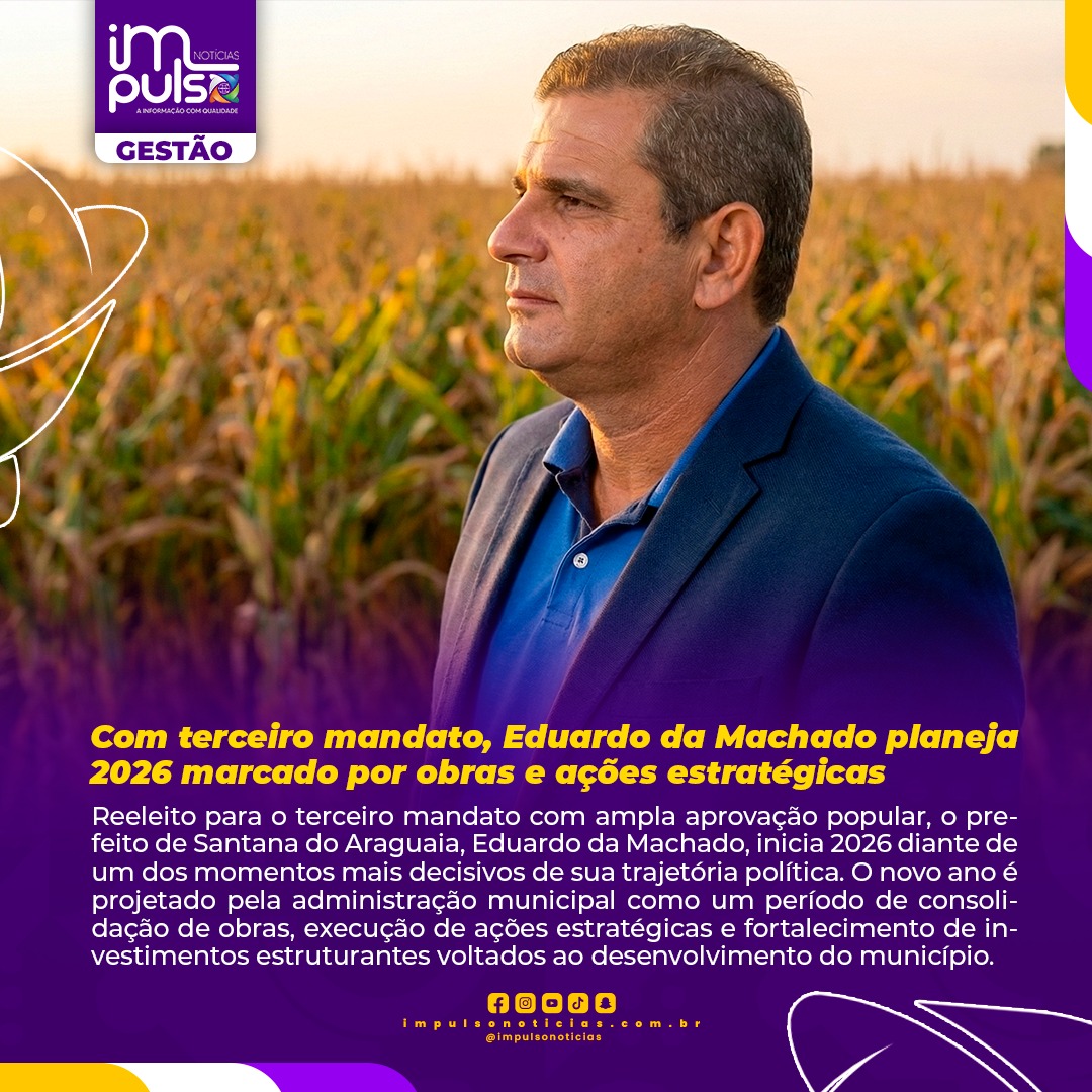 Reeleito para o terceiro mandato com ampla aprovação popular, o prefeito de Santana do Araguaia, Eduardo da Machado, inicia 2026 diante de um dos momentos mais decisivos de sua trajetória política. O novo ano é projetado pela administração municipal como um período de consolidação de obras, execução de ações estratégicas e fortalecimento de investimentos estruturantes voltados ao desenvolvimento do município.