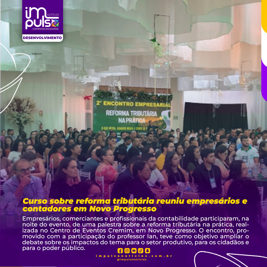 Empresários, comerciantes e profissionais da contabilidade participaram, na noite do evento, de uma palestra sobre a reforma tributária na prática, realizada no Centro de Eventos Cremim, em Novo Progresso. O encontro, promovido com a participação do professor Ian, teve como objetivo ampliar o debate sobre os impactos do tema para o setor produtivo, para os cidadãos e para o poder público.