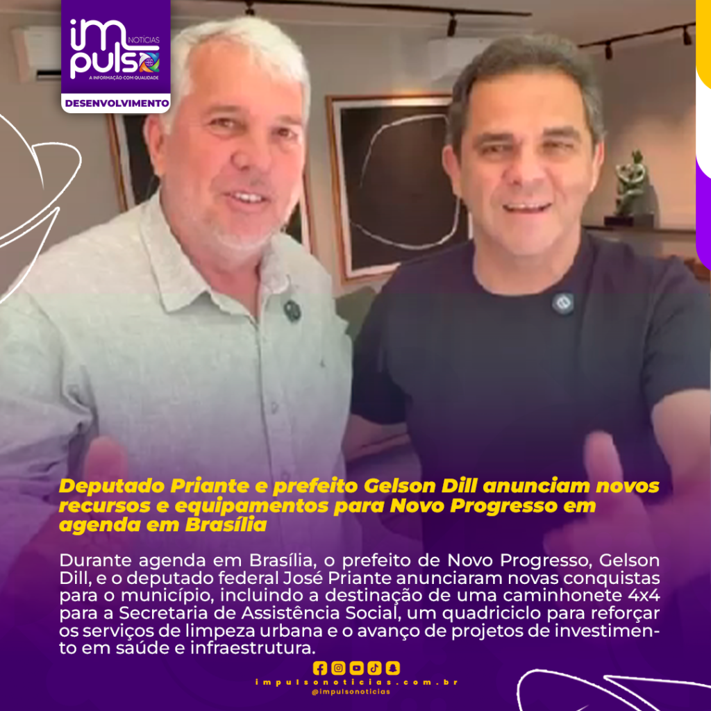 Durante agenda em Brasília, o prefeito de Novo Progresso, Gelson Dill, e o deputado federal José Priante anunciaram novas conquistas para o município, incluindo a destinação de uma caminhonete 4×4 para a Secretaria de Assistência Social, um quadriciclo para reforçar os serviços de limpeza urbana e o avanço de projetos de investimento em saúde e infraestrutura.