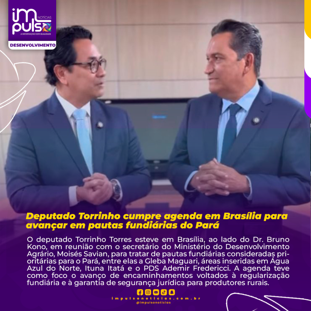 O deputado Torrinho Torres esteve em Brasília, ao lado do Dr. Bruno Kono, em reunião com o secretário do Ministério do Desenvolvimento Agrário, Moisés Savian, para tratar de pautas fundiárias consideradas prioritárias para o Pará, entre elas a Gleba Maguari, áreas inseridas em Água Azul do Norte, Ituna Itatá e o PDS Ademir Fredericci. A agenda teve como foco o avanço de encaminhamentos voltados à regularização fundiária e à garantia de segurança jurídica para produtores rurais.