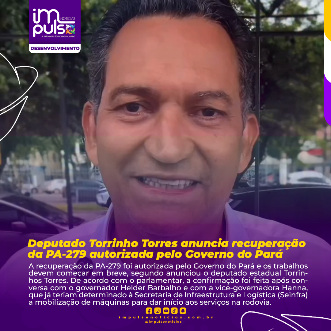 A recuperação da PA-279 foi autorizada pelo Governo do Pará e os trabalhos devem começar em breve, segundo anunciou o deputado estadual Torrinhos Torres. De acordo com o parlamentar, a confirmação foi feita após conversa com o governador Helder Barbalho e com a vice-governadora Hanna, que já teriam determinado à Secretaria de Infraestrutura e Logística (Seinfra) a mobilização de máquinas para dar início aos serviços na rodovia.