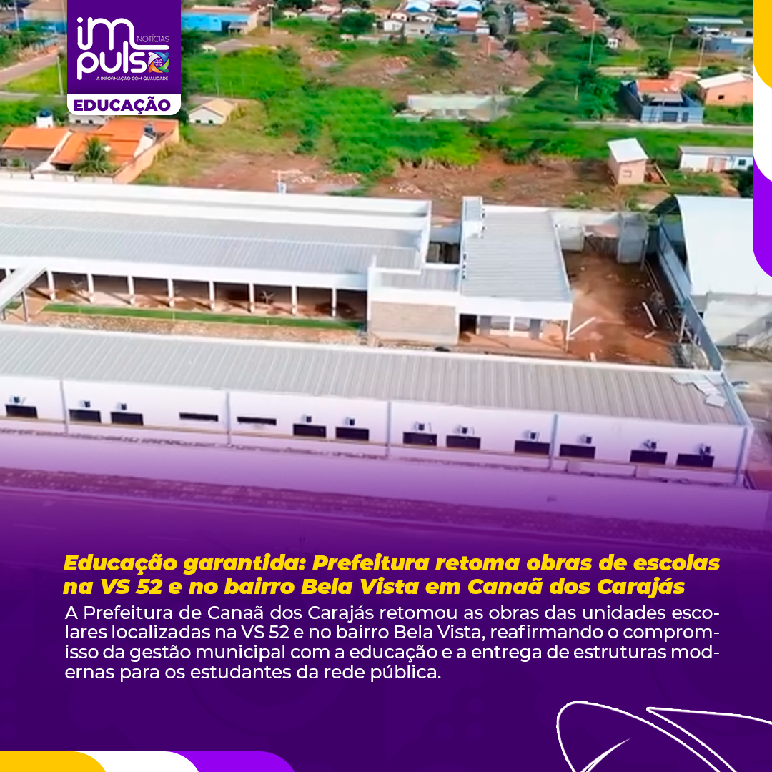 A Prefeitura de Canaã dos Carajás retomou as obras das unidades escolares localizadas na VS 52 e no bairro Bela Vista, reafirmando o compromisso da gestão municipal com a educação e a entrega de estruturas modernas para os estudantes da rede pública.