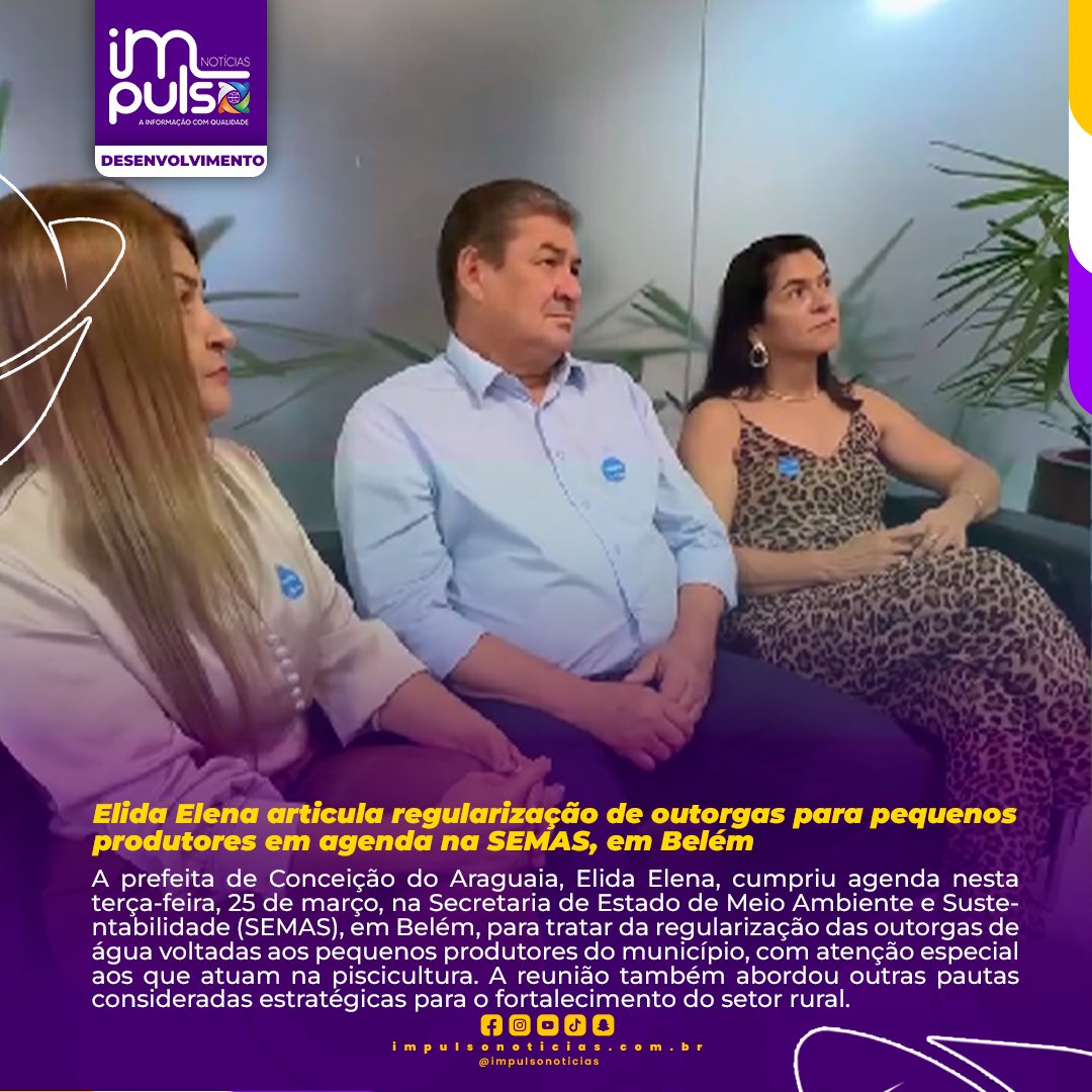 A prefeita de Conceição do Araguaia, Elida Elena, cumpriu agenda nesta terça-feira, 25 de março, na Secretaria de Estado de Meio Ambiente e Sustentabilidade (SEMAS), em Belém, para tratar da regularização das outorgas de água voltadas aos pequenos produtores do município, com atenção especial aos que atuam na piscicultura. A reunião também abordou outras pautas consideradas estratégicas para o fortalecimento do setor rural.