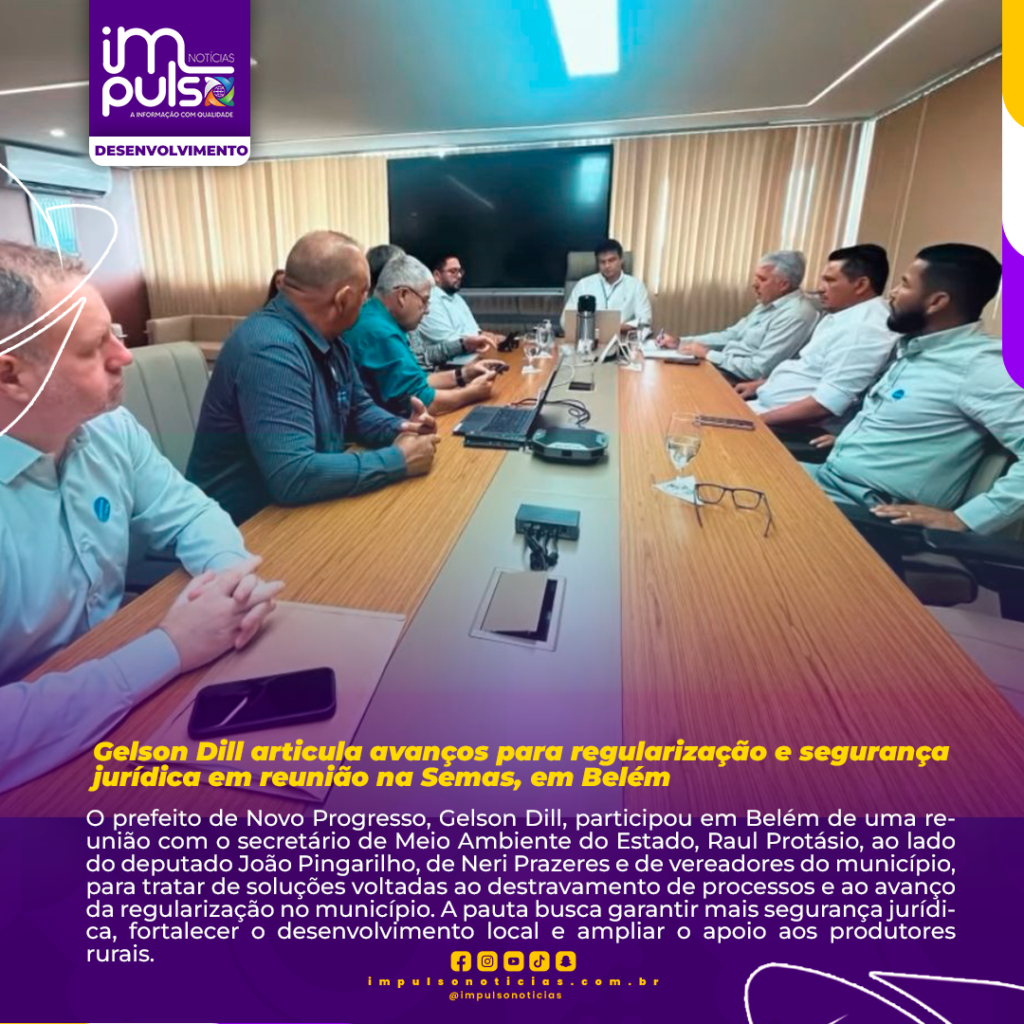 O prefeito de Novo Progresso, Gelson Dill, participou em Belém de uma reunião com o secretário de Meio Ambiente do Estado, Raul Protásio, ao lado do deputado João Pingarilho, de Neri Prazeres e de vereadores do município, para tratar de soluções voltadas ao destravamento de processos e ao avanço da regularização no município. A pauta busca garantir mais segurança jurídica, fortalecer o desenvolvimento local e ampliar o apoio aos produtores rurais.