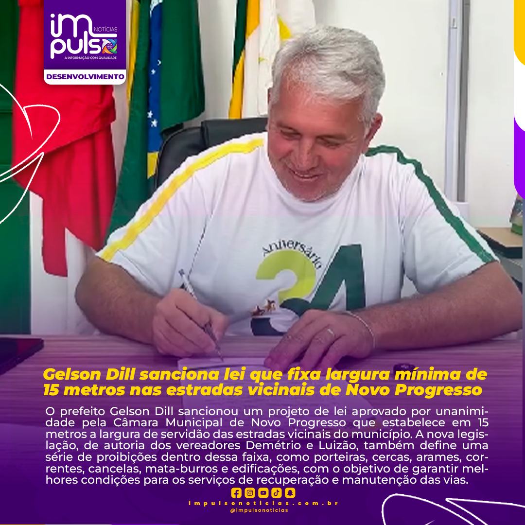 O prefeito Gelson Dill sancionou um projeto de lei aprovado por unanimidade pela Câmara Municipal de Novo Progresso que estabelece em 15 metros a largura de servidão das estradas vicinais do município. A nova legislação, de autoria dos vereadores Demétrio e Luizão, também define uma série de proibições dentro dessa faixa, como porteiras, cercas, arames, correntes, cancelas, mata-burros e edificações, com o objetivo de garantir melhores condições para os serviços de recuperação e manutenção das vias.