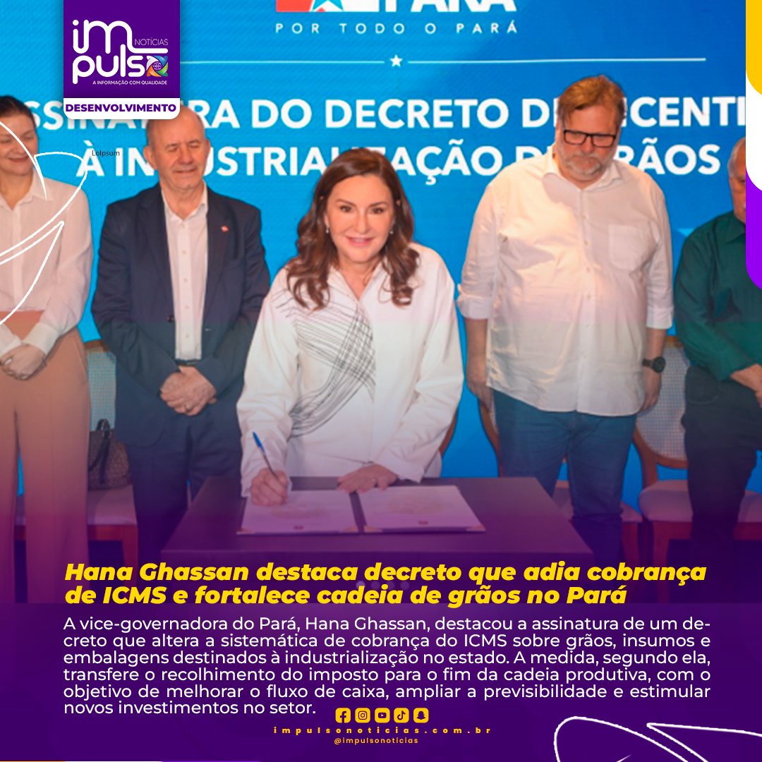 A vice-governadora do Pará, Hana Ghassan, destacou a assinatura de um decreto que altera a sistemática de cobrança do ICMS sobre grãos, insumos e embalagens destinados à industrialização no estado. A medida, segundo ela, transfere o recolhimento do imposto para o fim da cadeia produtiva, com o objetivo de melhorar o fluxo de caixa, ampliar a previsibilidade e estimular novos investimentos no setor.