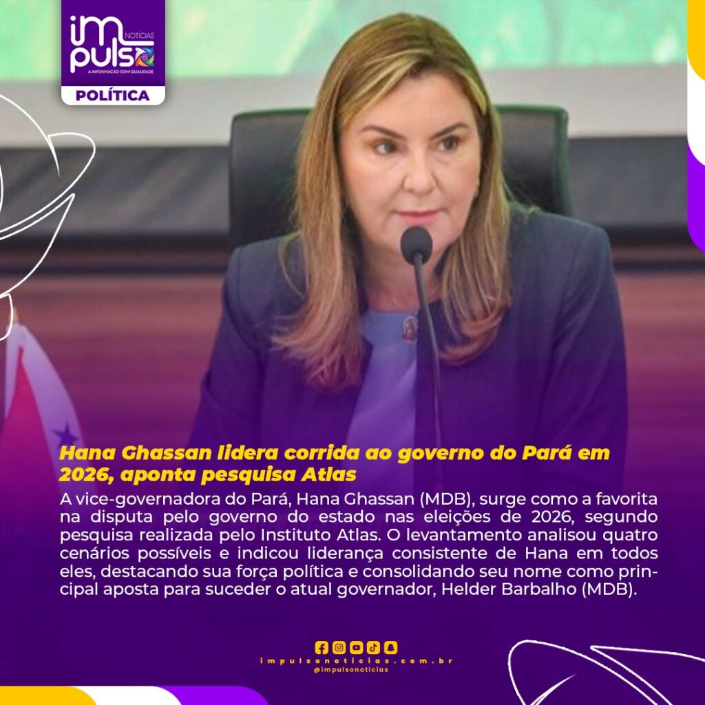 A vice-governadora do Pará, Hana Ghassan (MDB), surge como a favorita na disputa pelo governo do estado nas eleições de 2026, segundo pesquisa realizada pelo Instituto Atlas. O levantamento analisou quatro cenários possíveis e indicou liderança consistente de Hana em todos eles, destacando sua força política e consolidando seu nome como principal aposta para suceder o atual governador, Helder Barbalho (MDB).