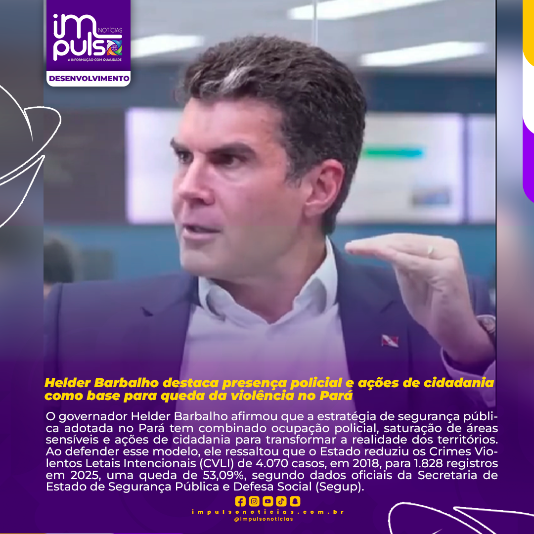 O governador Helder Barbalho afirmou que a estratégia de segurança pública adotada no Pará tem combinado ocupação policial, saturação de áreas sensíveis e ações de cidadania para transformar a realidade dos territórios. Ao defender esse modelo, ele ressaltou que o Estado reduziu os Crimes Violentos Letais Intencionais (CVLI) de 4.070 casos, em 2018, para 1.828 registros em 2025, uma queda de 53,09%, segundo dados oficiais da Secretaria de Estado de Segurança Pública e Defesa Social (Segup).