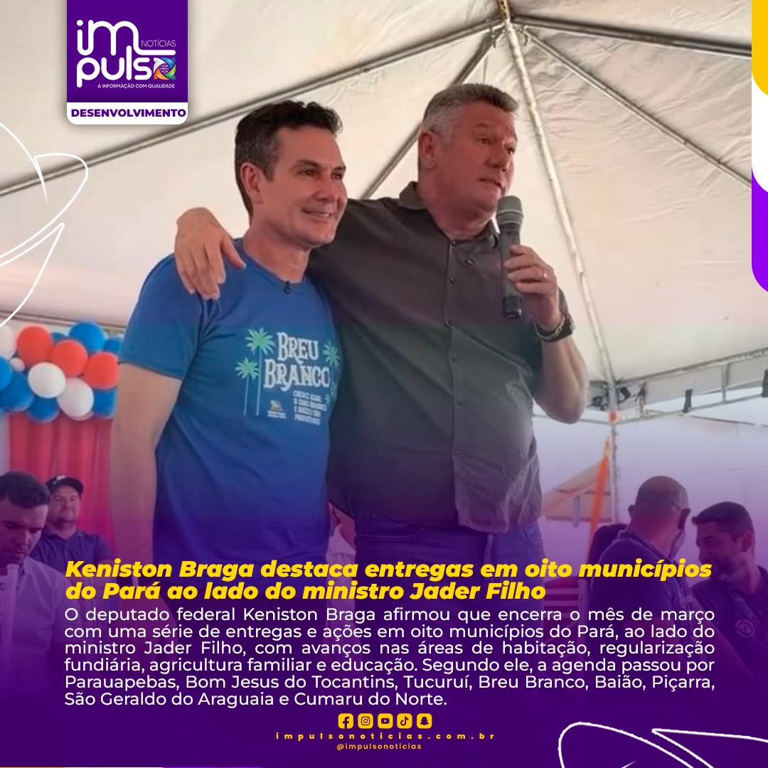 O deputado federal Keniston Braga afirmou que encerra o mês de março com uma série de entregas e ações em oito municípios do Pará, ao lado do ministro Jader Filho, com avanços nas áreas de habitação, regularização fundiária, agricultura familiar e educação. Segundo ele, a agenda passou por Parauapebas, Bom Jesus do Tocantins, Tucuruí, Breu Branco, Baião, Piçarra, São Geraldo do Araguaia e Cumaru do Norte.