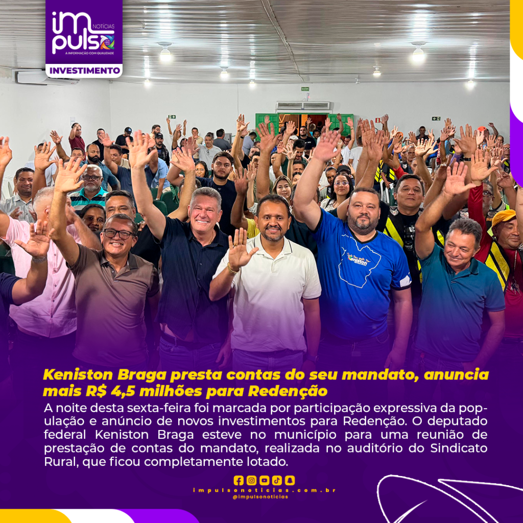 A noite desta sexta-feira foi marcada por participação expressiva da população e anúncio de novos investimentos para Redenção. O deputado federal Keniston Braga esteve no município para uma reunião de prestação de contas do mandato, realizada no auditório do Sindicato Rural, que ficou completamente lotado.