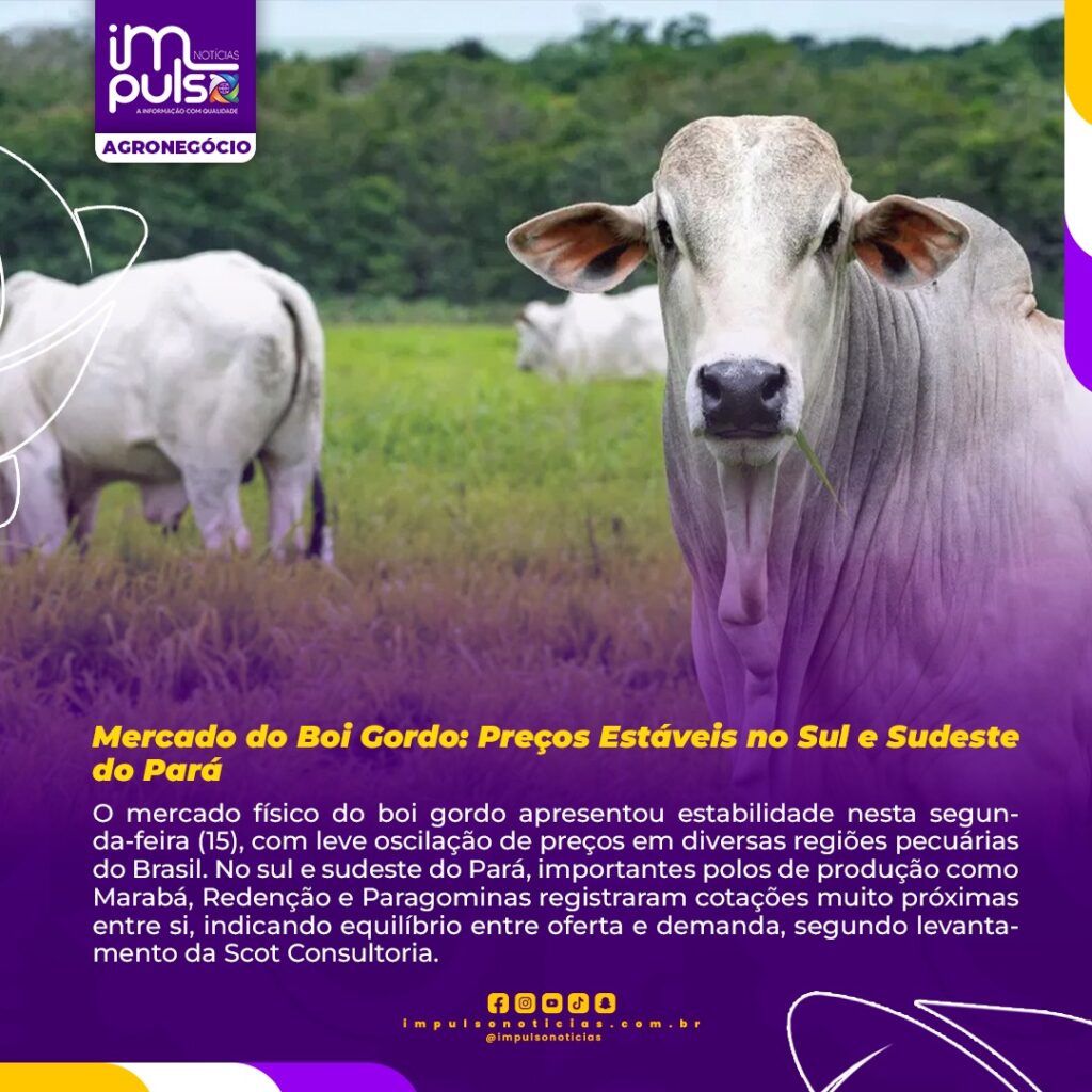 O mercado físico do boi gordo apresentou estabilidade nesta segunda-feira (15), com leve oscilação de preços em diversas regiões pecuárias do Brasil. No sul e sudeste do Pará, importantes polos de produção como Marabá, Redenção e Paragominas registraram cotações muito próximas entre si, indicando equilíbrio entre oferta e demanda, segundo levantamento da Scot Consultoria.