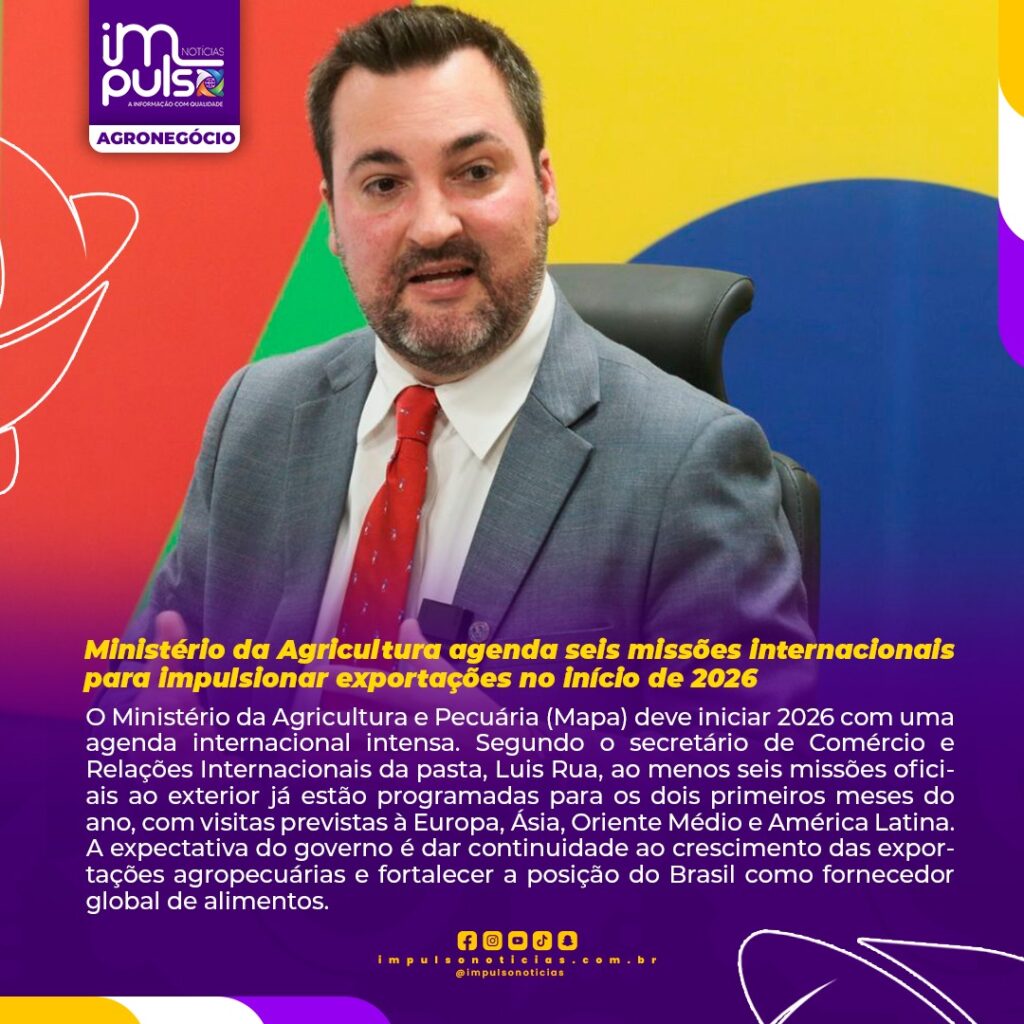 O Ministério da Agricultura e Pecuária (Mapa) deve iniciar 2026 com uma agenda internacional intensa. Segundo o secretário de Comércio e Relações Internacionais da pasta, Luis Rua, ao menos seis missões oficiais ao exterior já estão programadas para os dois primeiros meses do ano, com visitas previstas à Europa, Ásia, Oriente Médio e América Latina. A expectativa do governo é dar continuidade ao crescimento das exportações agropecuárias e fortalecer a posição do Brasil como fornecedor global de alimentos.
