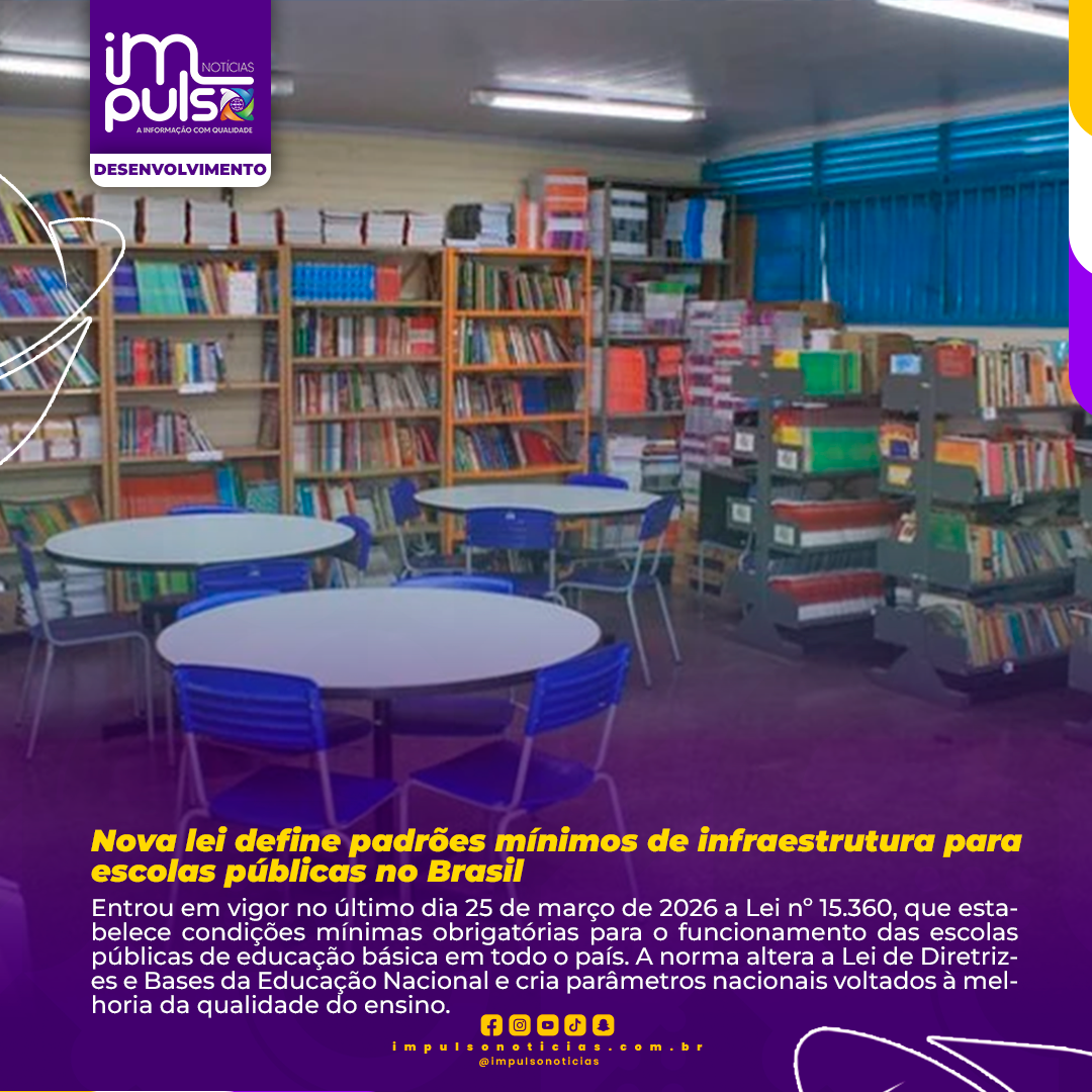 Entrou em vigor no último dia 25 de março de 2026 a Lei nº 15.360, que estabelece condições mínimas obrigatórias para o funcionamento das escolas públicas de educação básica em todo o país. A norma altera a Lei de Diretrizes e Bases da Educação Nacional e cria parâmetros nacionais voltados à melhoria da qualidade do ensino.