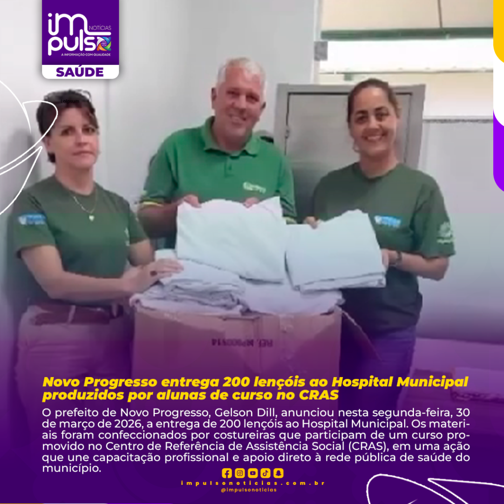 O prefeito de Novo Progresso, Gelson Dill, anunciou nesta segunda-feira, 30 de março de 2026, a entrega de 200 lençóis ao Hospital Municipal. Os materiais foram confeccionados por costureiras que participam de um curso promovido no Centro de Referência de Assistência Social (CRAS), em uma ação que une capacitação profissional e apoio direto à rede pública de saúde do município.