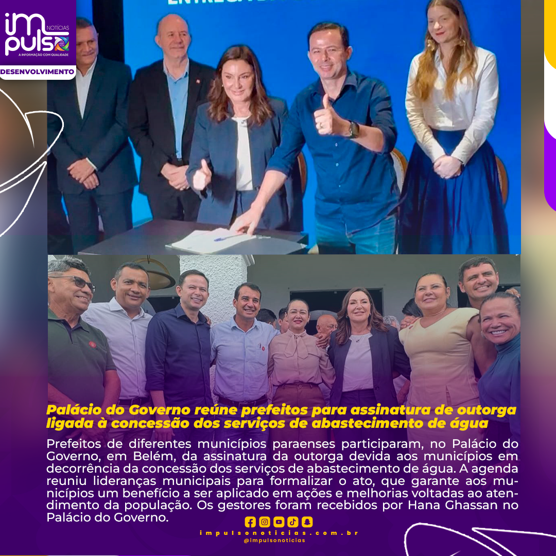 Prefeitos de diferentes municípios paraenses participaram, no Palácio do Governo, em Belém, da assinatura da outorga devida aos municípios em decorrência da concessão dos serviços de abastecimento de água. A agenda reuniu lideranças municipais para formalizar o ato, que garante aos municípios um benefício a ser aplicado em ações e melhorias voltadas ao atendimento da população. Os gestores foram recebidos por Hana Ghassan no Palácio do Governo.