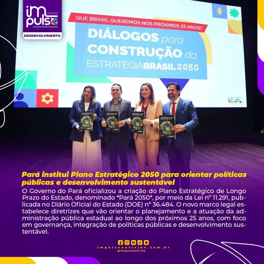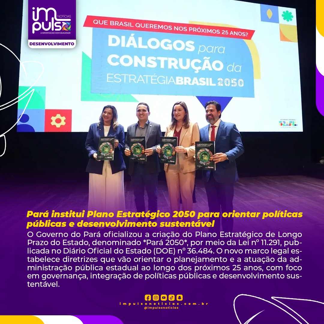 O Governo do Pará oficializou a criação do Plano Estratégico de Longo Prazo do Estado, denominado Pará 2050, por meio da Lei nº 11.291, publicada no Diário Oficial do Estado (DOE) nº 36.484. O novo marco legal estabelece diretrizes que vão orientar o planejamento e a atuação da administração pública estadual ao longo dos próximos 25 anos, com foco em governança, integração de políticas públicas e desenvolvimento sustentável.