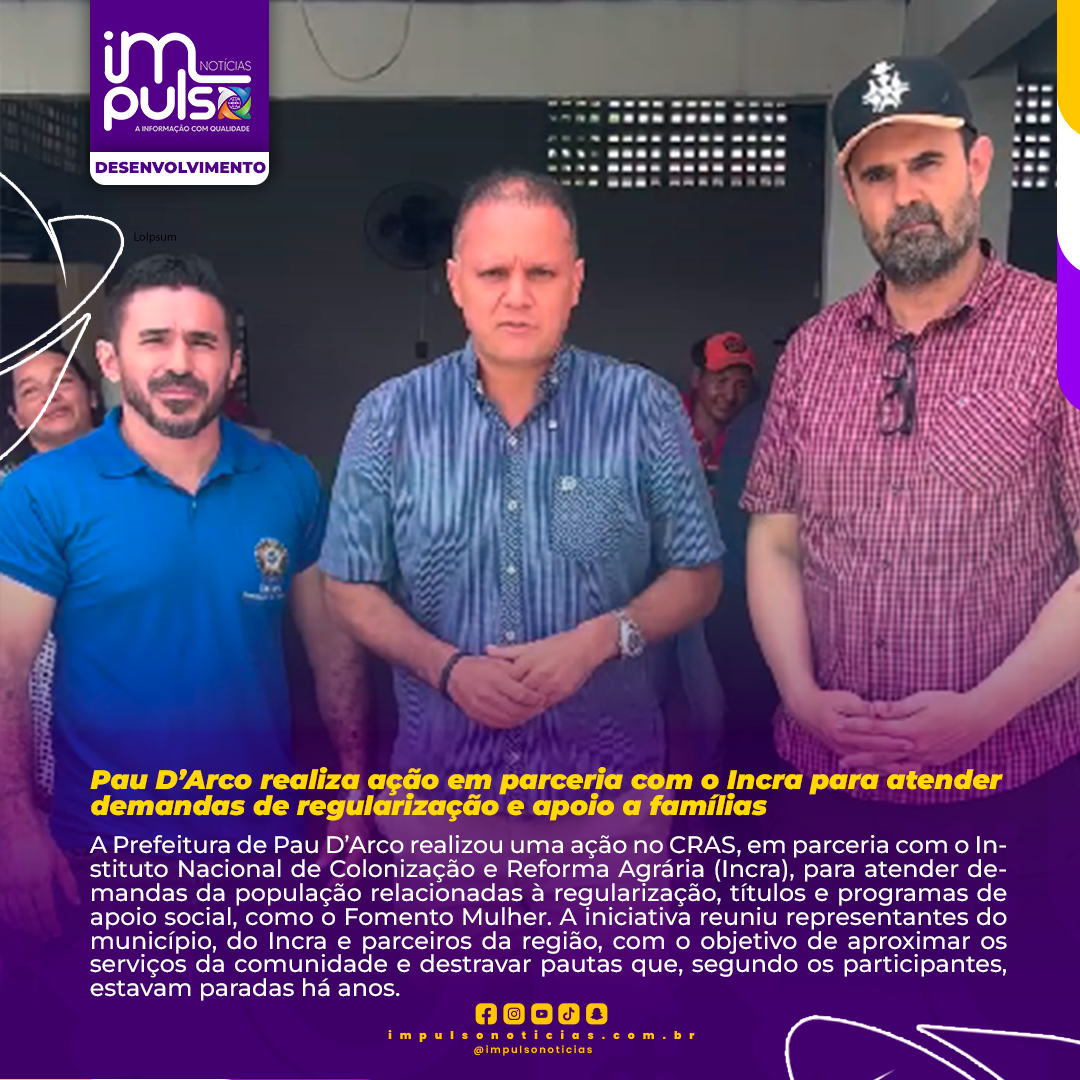 A Prefeitura de Pau D’Arco realizou uma ação no CRAS, em parceria com o Instituto Nacional de Colonização e Reforma Agrária (Incra), para atender demandas da população relacionadas à regularização, títulos e programas de apoio social, como o Fomento Mulher. A iniciativa reuniu representantes do município, do Incra e parceiros da região, com o objetivo de aproximar os serviços da comunidade e destravar pautas que, segundo os participantes, estavam paradas há anos.