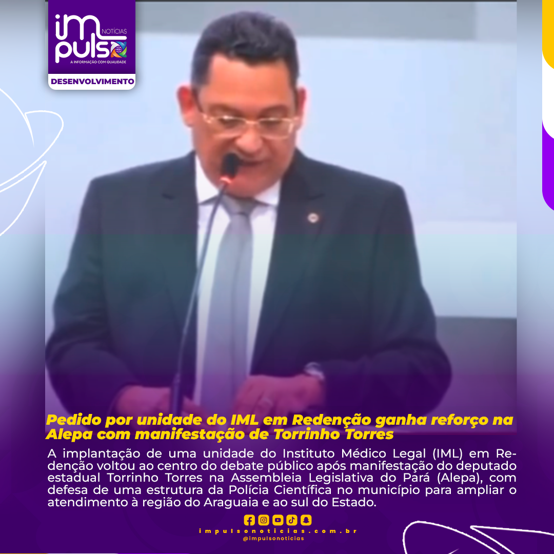 A implantação de uma unidade do Instituto Médico Legal (IML) em Redenção voltou ao centro do debate público após manifestação do deputado estadual Torrinho Torres na Assembleia Legislativa do Pará (Alepa), com defesa de uma estrutura da Polícia Científica no município para ampliar o atendimento à região do Araguaia e ao sul do Estado.