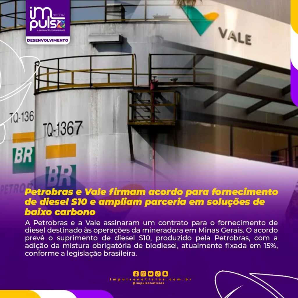 A Petrobras e a Vale assinaram um contrato para o fornecimento de diesel destinado às operações da mineradora em Minas Gerais. O acordo prevê o suprimento de diesel S10, produzido pela Petrobras, com a adição da mistura obrigatória de biodiesel, atualmente fixada em 15%, conforme a legislação brasileira.