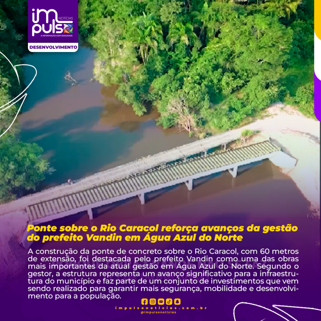 A construção da ponte de concreto sobre o Rio Caracol, com 60 metros de extensão, foi destacada pelo prefeito Vandin como uma das obras mais importantes da atual gestão em Água Azul do Norte. Segundo o gestor, a estrutura representa um avanço significativo para a infraestrutura do município e faz parte de um conjunto de investimentos que vem sendo realizado para garantir mais segurança, mobilidade e desenvolvimento para a população.