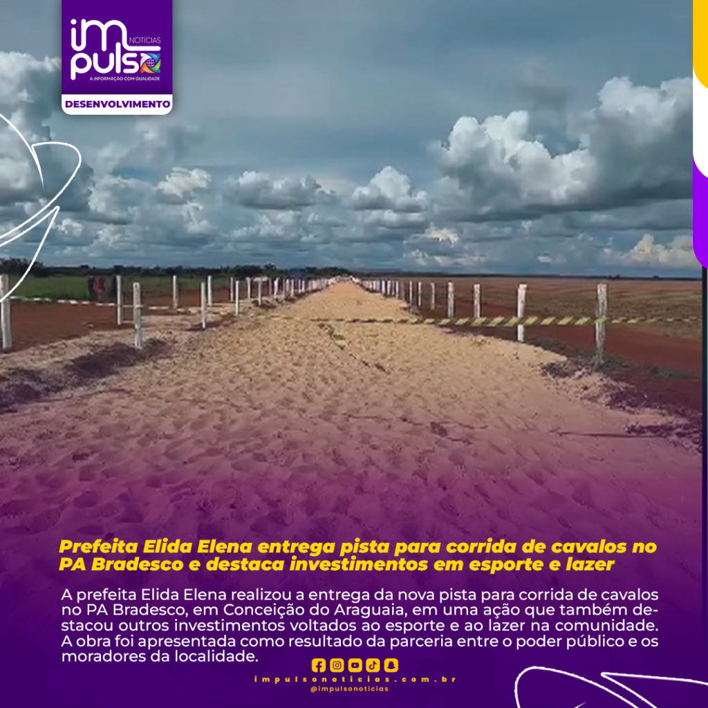 A prefeita Elida Elena realizou a entrega da nova pista para corrida de cavalos no PA Bradesco, em Conceição do Araguaia, em uma ação que também destacou outros investimentos voltados ao esporte e ao lazer na comunidade. A obra foi apresentada como resultado da parceria entre o poder público e os moradores da localidade.