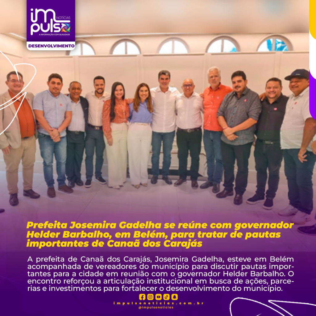 A prefeita de Canaã dos Carajás, Josemira Gadelha, esteve em Belém acompanhada de vereadores do município para discutir pautas importantes para a cidade em reunião com o governador Helder Barbalho. O encontro reforçou a articulação institucional em busca de ações, parcerias e investimentos para fortalecer o desenvolvimento do município.