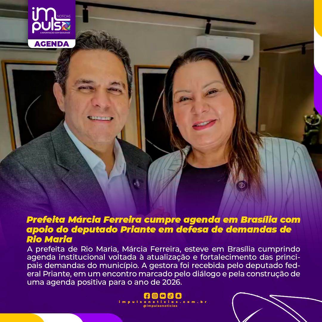 A prefeita de Rio Maria, Márcia Ferreira, esteve em Brasília cumprindo agenda institucional voltada à atualização e fortalecimento das principais demandas do município. A gestora foi recebida pelo deputado federal Priante, em um encontro marcado pelo diálogo e pela construção de uma agenda positiva para o ano de 2026.