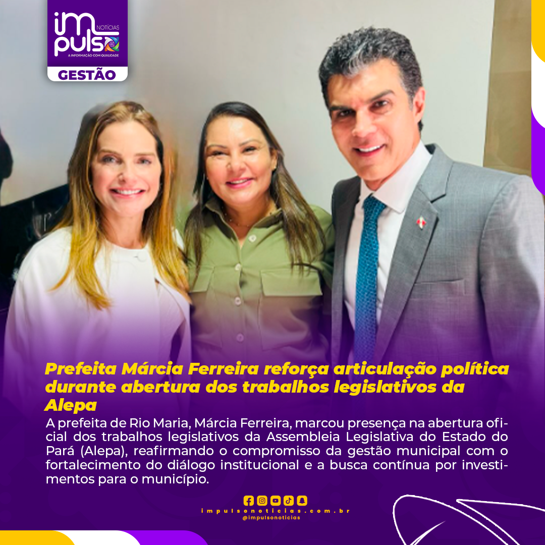 A prefeita de Rio Maria, Márcia Ferreira, marcou presença na abertura oficial dos trabalhos legislativos da Assembleia Legislativa do Estado do Pará (Alepa), reafirmando o compromisso da gestão municipal com o fortalecimento do diálogo institucional e a busca contínua por investimentos para o município.