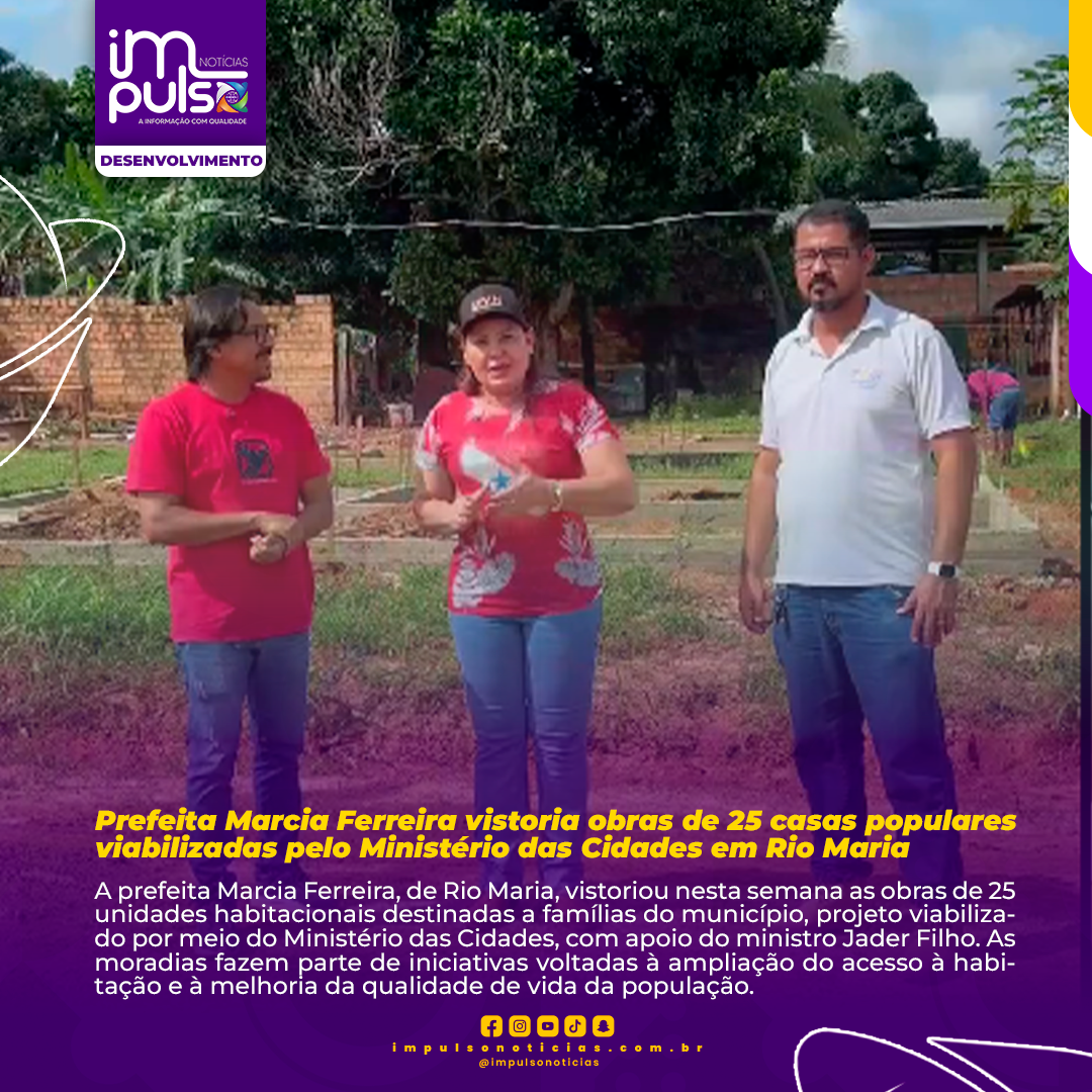 A prefeita Marcia Ferreira, de Rio Maria, vistoriou nesta semana as obras de 25 unidades habitacionais destinadas a famílias do município, projeto viabilizado por meio do Ministério das Cidades, com apoio do ministro Jader Filho. As moradias fazem parte de iniciativas voltadas à ampliação do acesso à habitação e à melhoria da qualidade de vida da população.