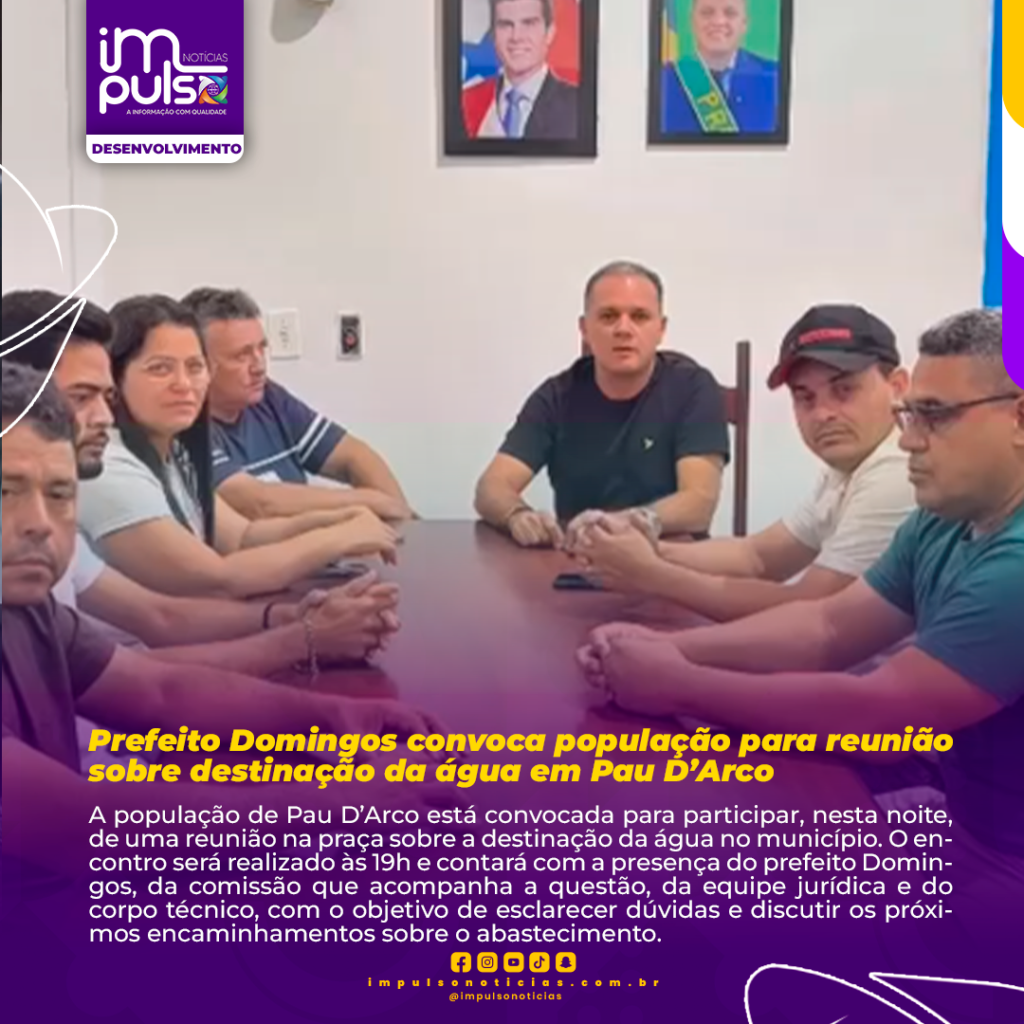A população de Pau D’Arco está convocada para participar, nesta noite, de uma reunião na praça sobre a destinação da água no município. O encontro será realizado às 19h e contará com a presença do prefeito Domingos, da comissão que acompanha a questão, da equipe jurídica e do corpo técnico, com o objetivo de esclarecer dúvidas e discutir os próximos encaminhamentos sobre o abastecimento.
