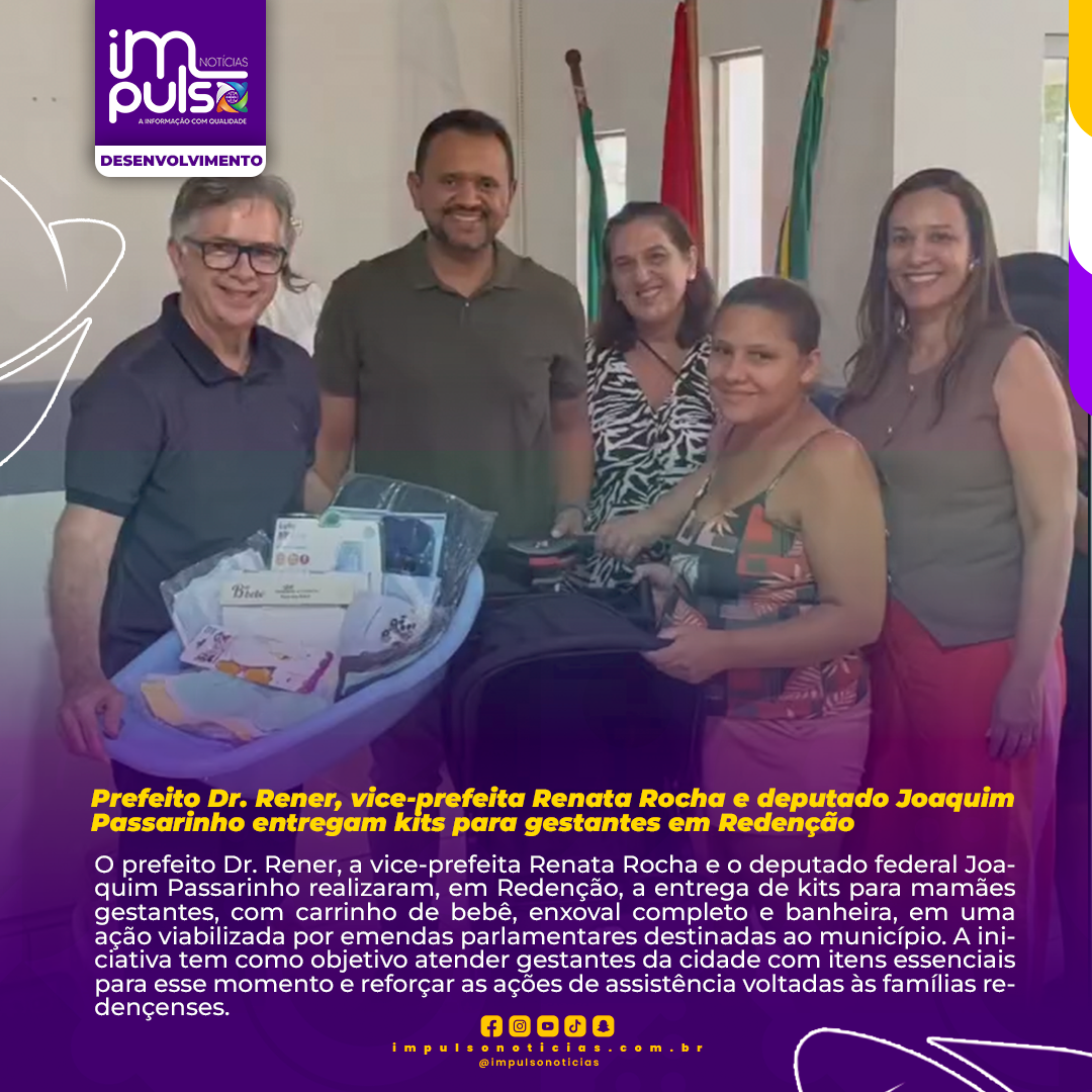 O prefeito Dr. Rener, a vice-prefeita Renata Rocha e o deputado federal Joaquim Passarinho realizaram, em Redenção, a entrega de kits para mamães gestantes, com carrinho de bebê, enxoval completo e banheira, em uma ação viabilizada por emendas parlamentares destinadas ao município. A iniciativa tem como objetivo atender gestantes da cidade com itens essenciais para esse momento e reforçar as ações de assistência voltadas às famílias redençenses.