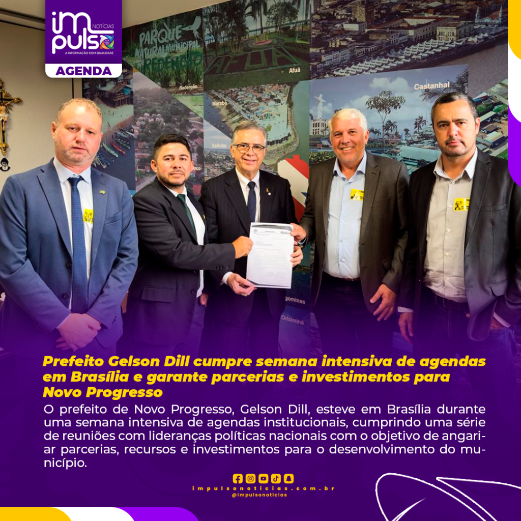 O prefeito de Novo Progresso, Gelson Dill, esteve em Brasília durante uma semana intensiva de agendas institucionais, cumprindo uma série de reuniões com lideranças políticas nacionais com o objetivo de angariar parcerias, recursos e investimentos para o desenvolvimento do município.