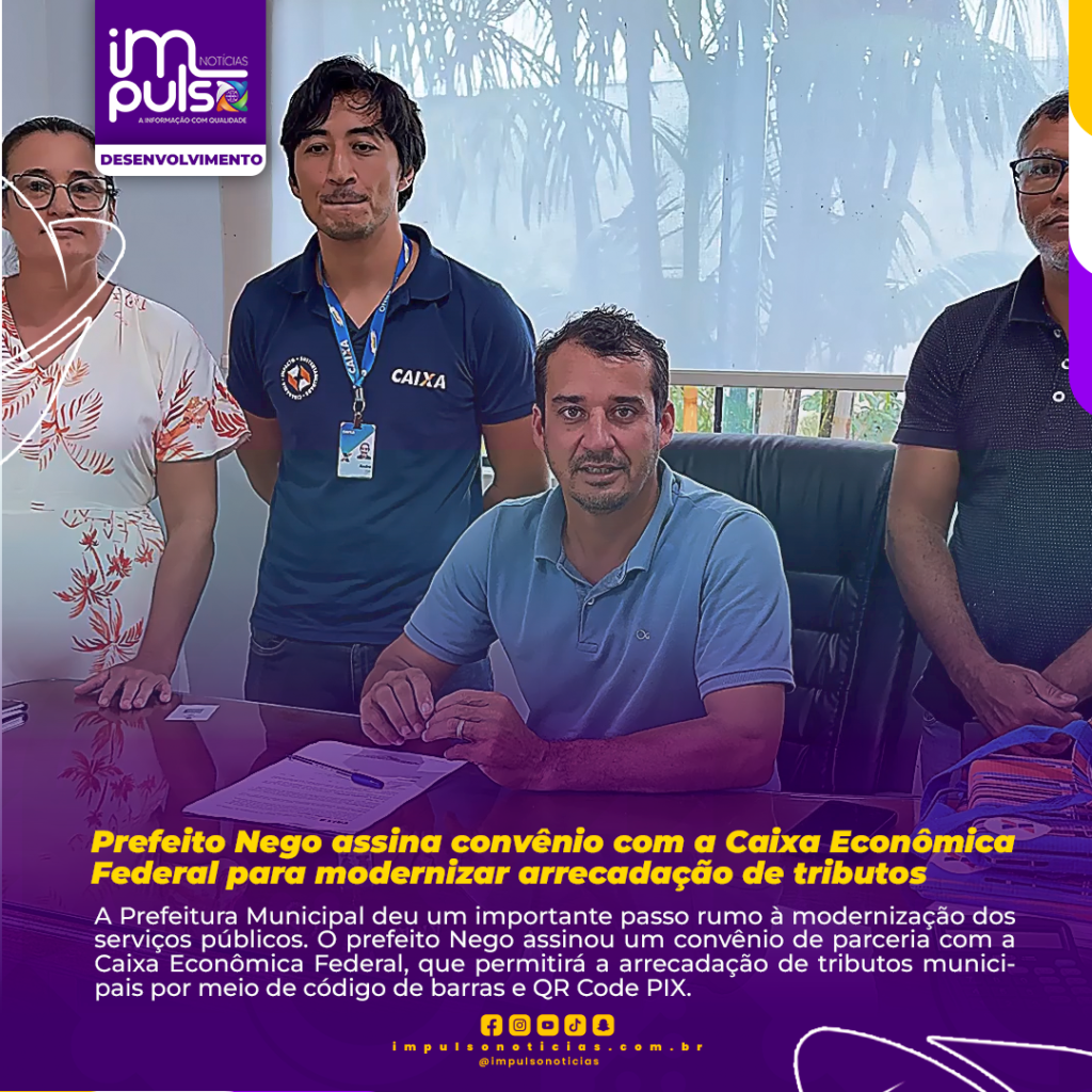 A Prefeitura Municipal deu um importante passo rumo à modernização dos serviços públicos. O prefeito Nego assinou um convênio de parceria com a Caixa Econômica Federal, que permitirá a arrecadação de tributos municipais por meio de código de barras e QR Code PIX.