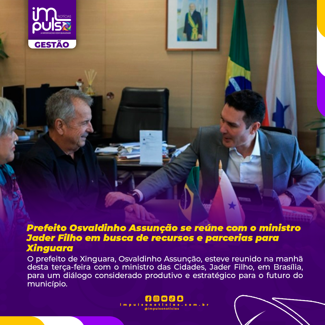 O prefeito agradeceu a recepção e a atenção dispensada pelo ministro Jader Filho, destacando a importância do diálogo direto com o Governo Federal para garantir avanços estruturantes ao município. Segundo Osvaldinho Assunção, a agenda reforça o compromisso da gestão municipal em trabalhar de forma articulada e persistente em defesa dos interesses da população xinguarense.
