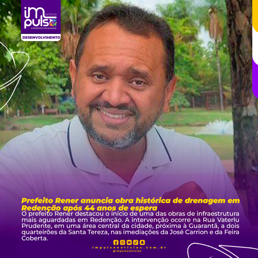O prefeito Rener destacou o início de uma das obras de infraestrutura mais aguardadas em Redenção. A intervenção ocorre na Rua Vaterlu Prudente, em uma área central da cidade, próxima à Guarantã, a dois quarteirões da Santa Tereza, nas imediações da José Carrion e da Feira Coberta.
