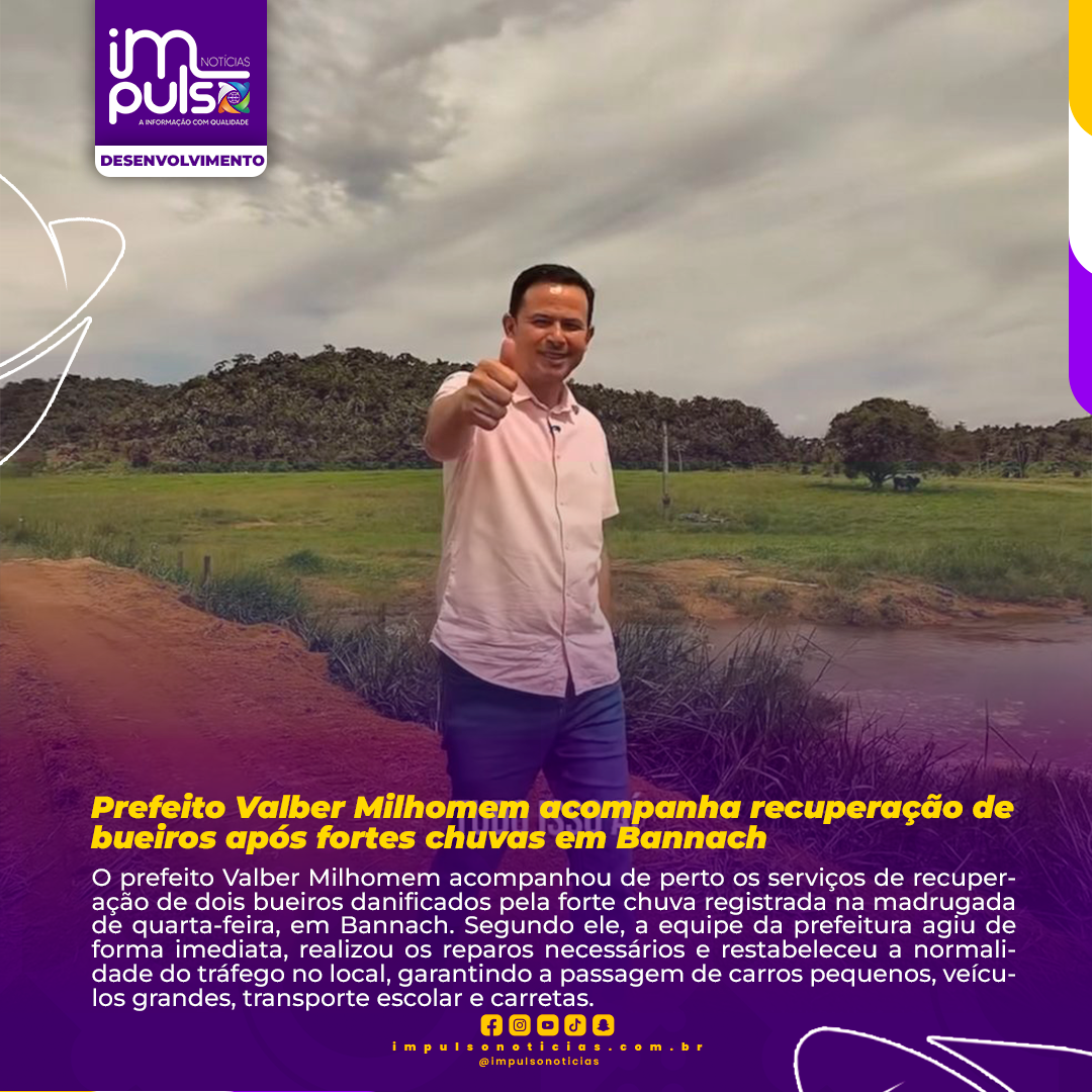 O prefeito Valber Milhomem acompanhou de perto os serviços de recuperação de dois bueiros danificados pela forte chuva registrada na madrugada de quarta-feira, em Bannach. Segundo ele, a equipe da prefeitura agiu de forma imediata, realizou os reparos necessários e restabeleceu a normalidade do tráfego no local, garantindo a passagem de carros pequenos, veículos grandes, transporte escolar e carretas.