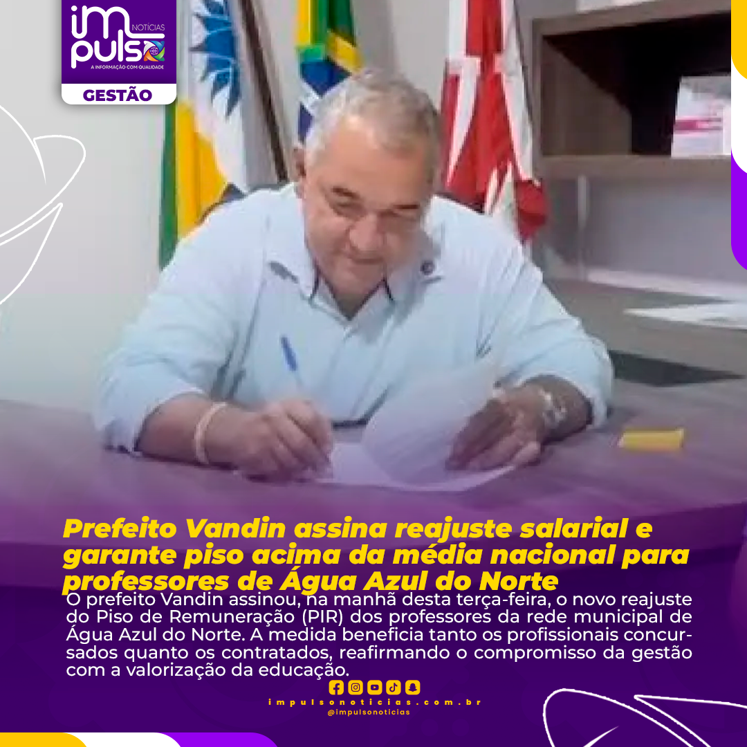 O prefeito Vandin assinou, na manhã desta terça-feira, o novo reajuste do Piso de Remuneração (PIR) dos professores da rede municipal de Água Azul do Norte. A medida beneficia tanto os profissionais concursados quanto os contratados, reafirmando o compromisso da gestão com a valorização da educação.