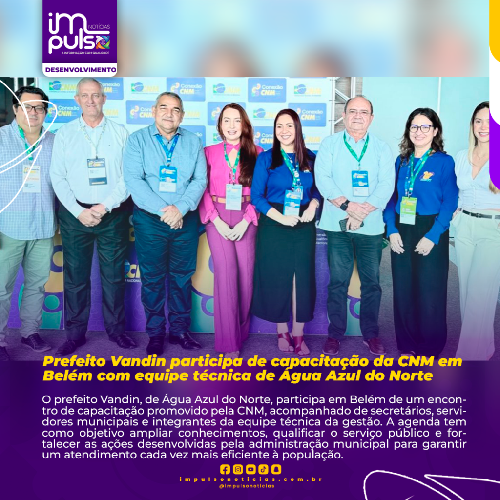O prefeito Vandin, de Água Azul do Norte, participa em Belém de um encontro de capacitação promovido pela CNM, acompanhado de secretários, servidores municipais e integrantes da equipe técnica da gestão. A agenda tem como objetivo ampliar conhecimentos, qualificar o serviço público e fortalecer as ações desenvolvidas pela administração municipal para garantir um atendimento cada vez mais eficiente à população.