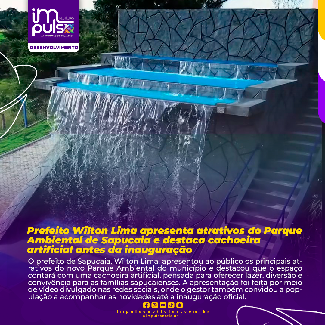 O prefeito de Sapucaia, Wilton Lima, apresentou ao público os principais atrativos do novo Parque Ambiental do município e destacou que o espaço contará com uma cachoeira artificial, pensada para oferecer lazer, diversão e convivência para as famílias sapucaienses. A apresentação foi feita por meio de vídeo divulgado nas redes sociais, onde o gestor também convidou a população a acompanhar as novidades até a inauguração oficial.